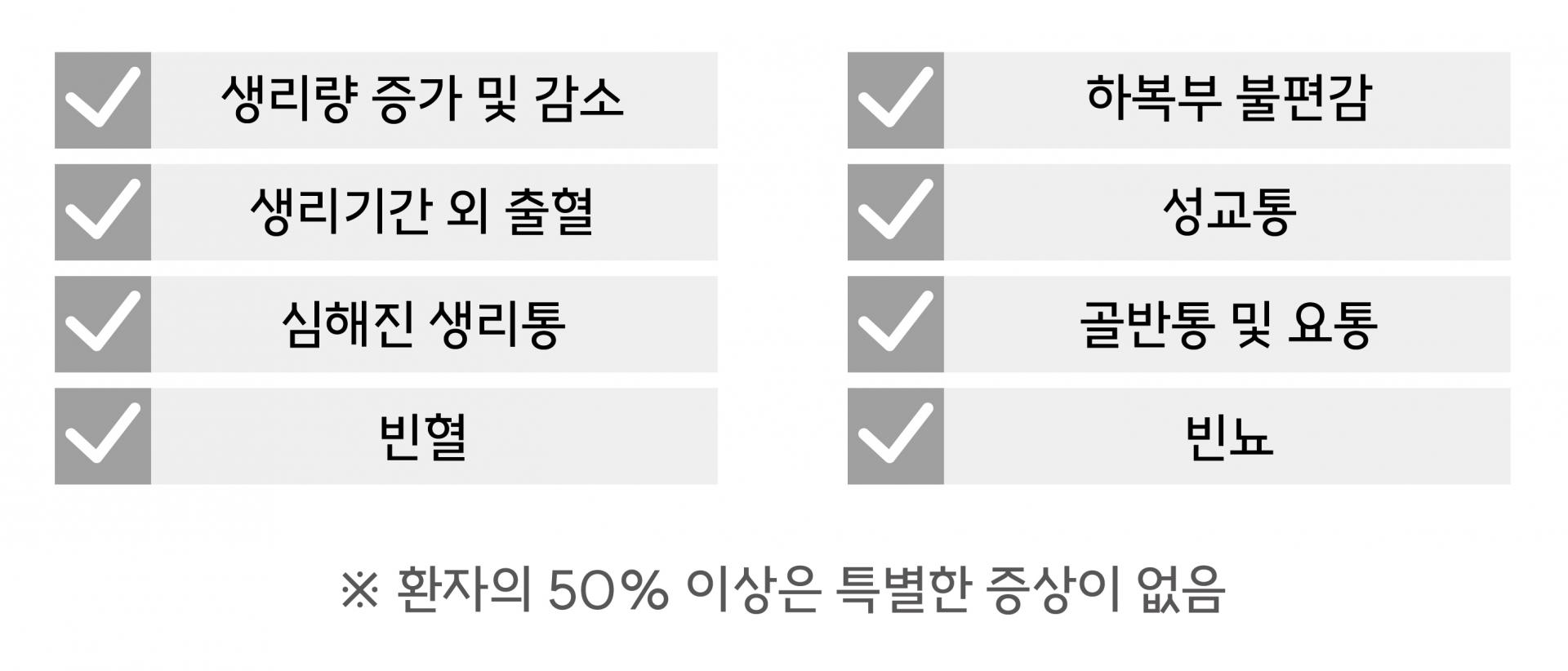 자궁근종 환자의 약 50%에서는 특별한 증상을 보이지 않아 건강검진 시 우연히 발견되는 경우가 많습니다. 증상이 있는 경우에는 과다월경, 부정기출혈, 월결곤란증(월경통), 골반통, 빈혈, 빈뇨 등의 증상을 보일 수 있으며 성교통, 요통 등을 동반할 수 있습니다.