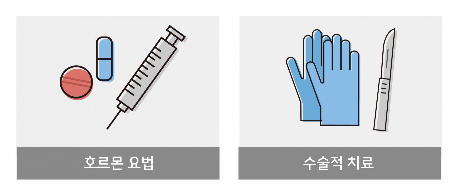 증상이 없거나, 경미한 경우는 경과를 관찰 할 수 있지만 근종의 크기가 크거나 짧은 기간 내 크기가 증가하는 경우, 일반적인 건강과 삶의 질에 영향을 미치는 질 출혈/빈혈/통증 등을 동반하는 경우, 임신/출산 계획이 있는 경우 환자의 연령/폐경여부/임신계획/선호도를 고려하여 호르몬요법, 자궁근종 적출술 또는 자궁적출술 등을 실시할 수 있습니다.